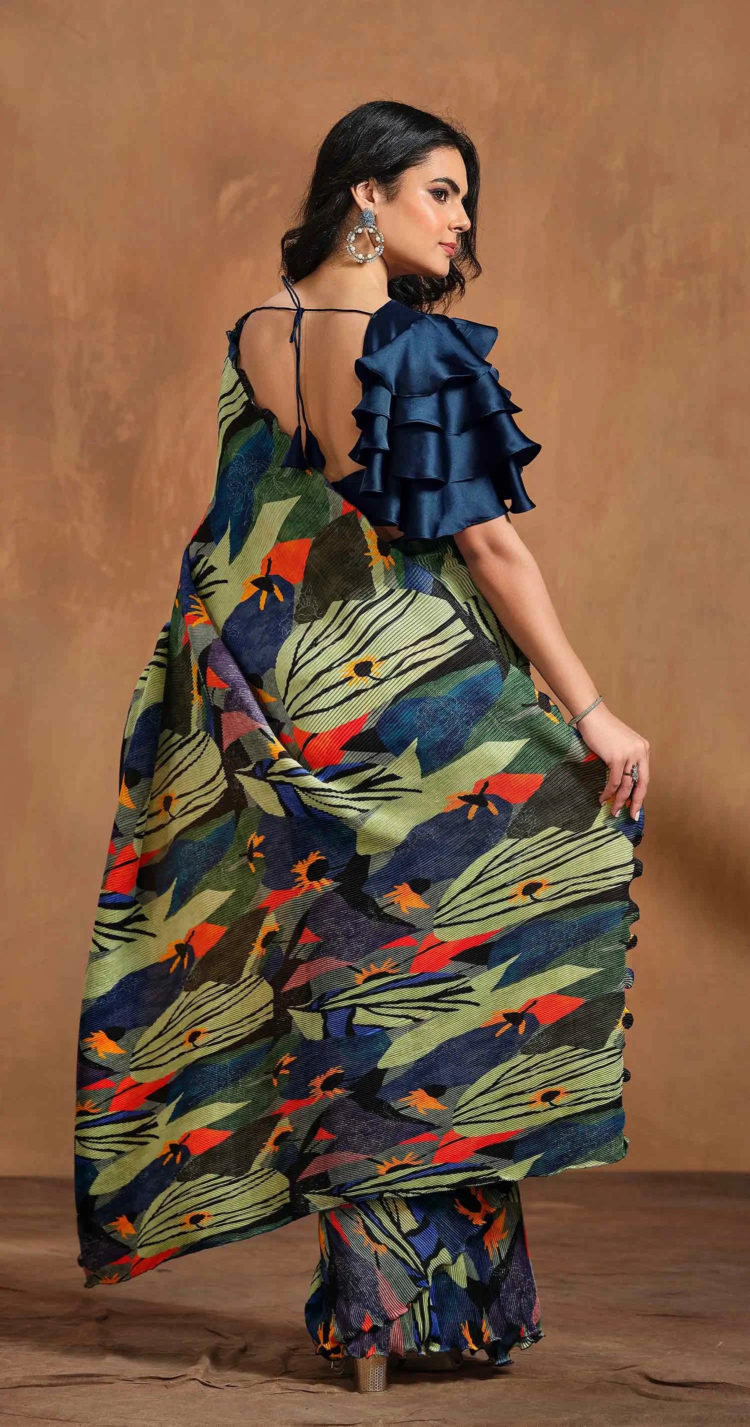 Olive Green With Multi Color Digital Print Ready To Wear One Minute Saree