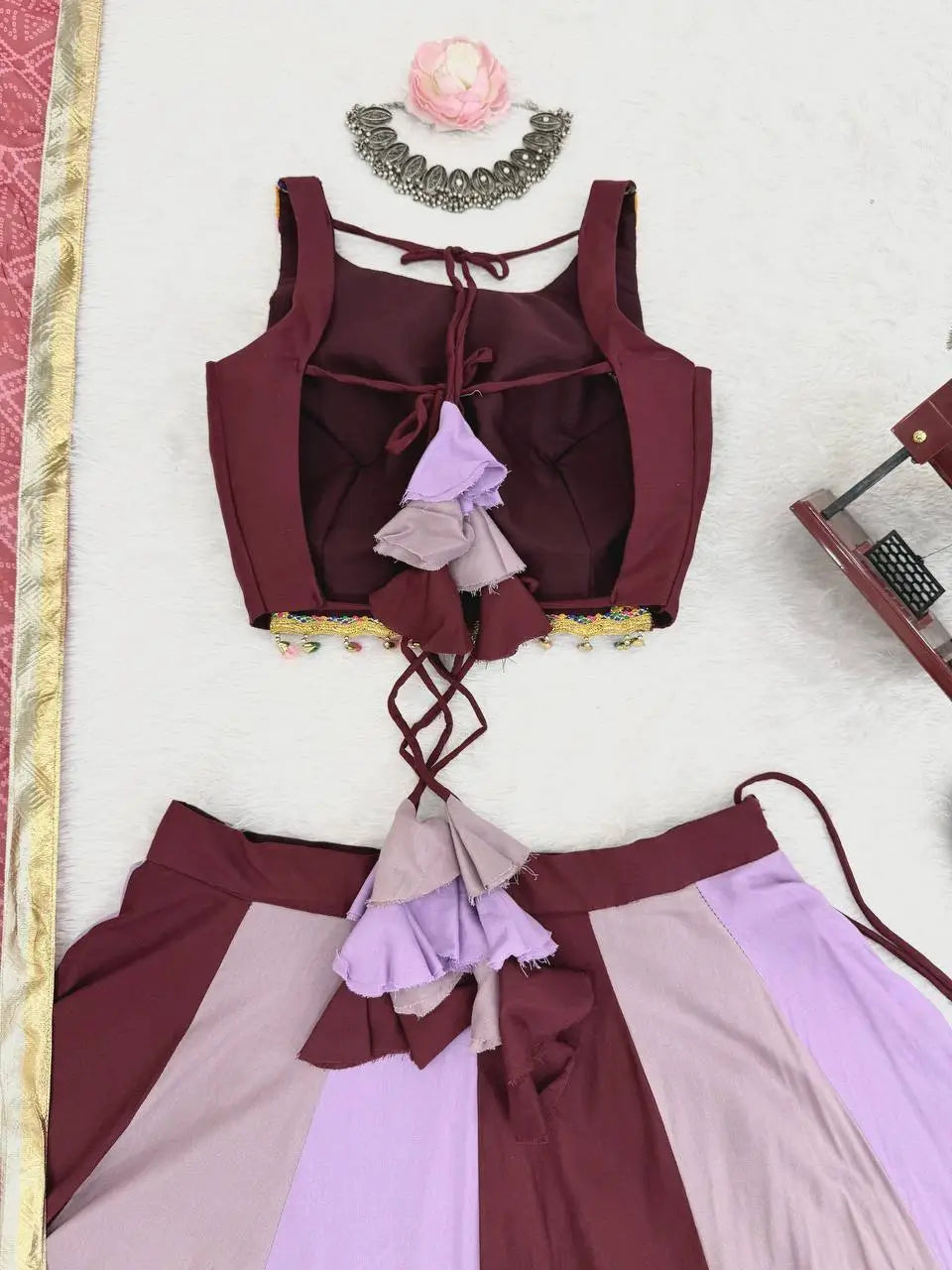 Introducing our Navratri lehenga set in rayon, adorned with multi color kali work. Paired with matching gamthi work blouse and dupatta sequins with lace border, it’s perfect for Garba nights and festive vibes.