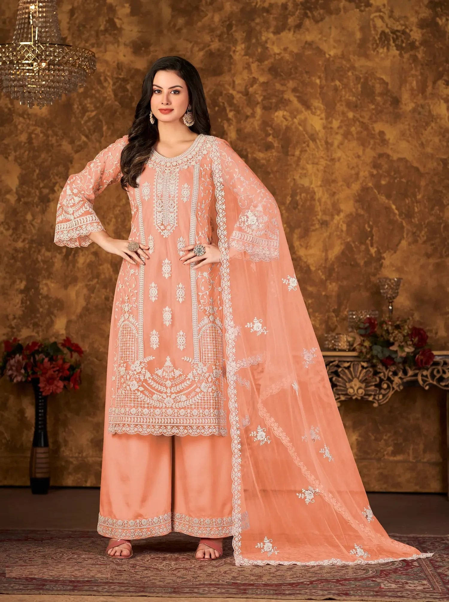 Peach Net Salwar Suit With Thread & Sequence Embroidery Work