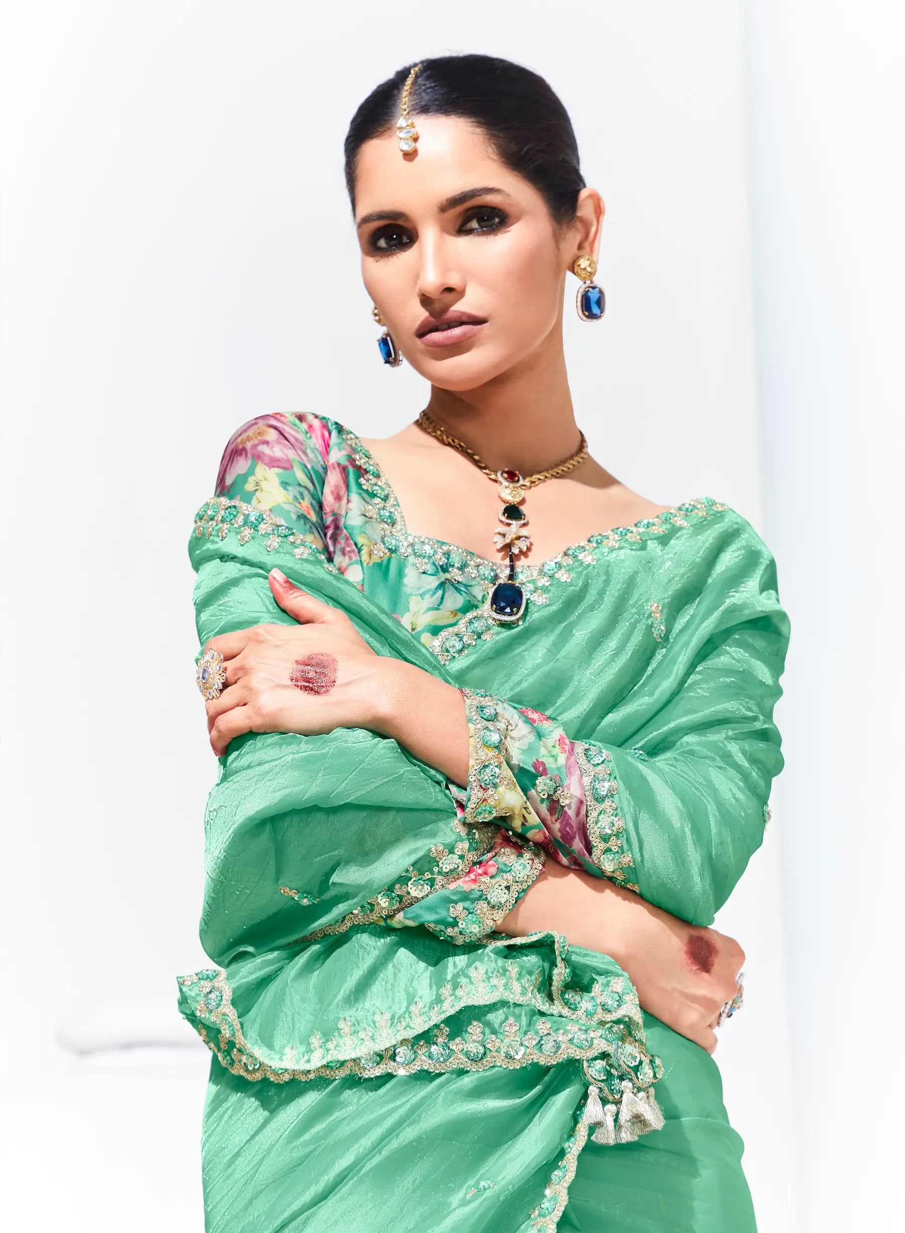 Pista Green Glass Organza Saree With Digital Print, Sequence & Thread Embroidery Work