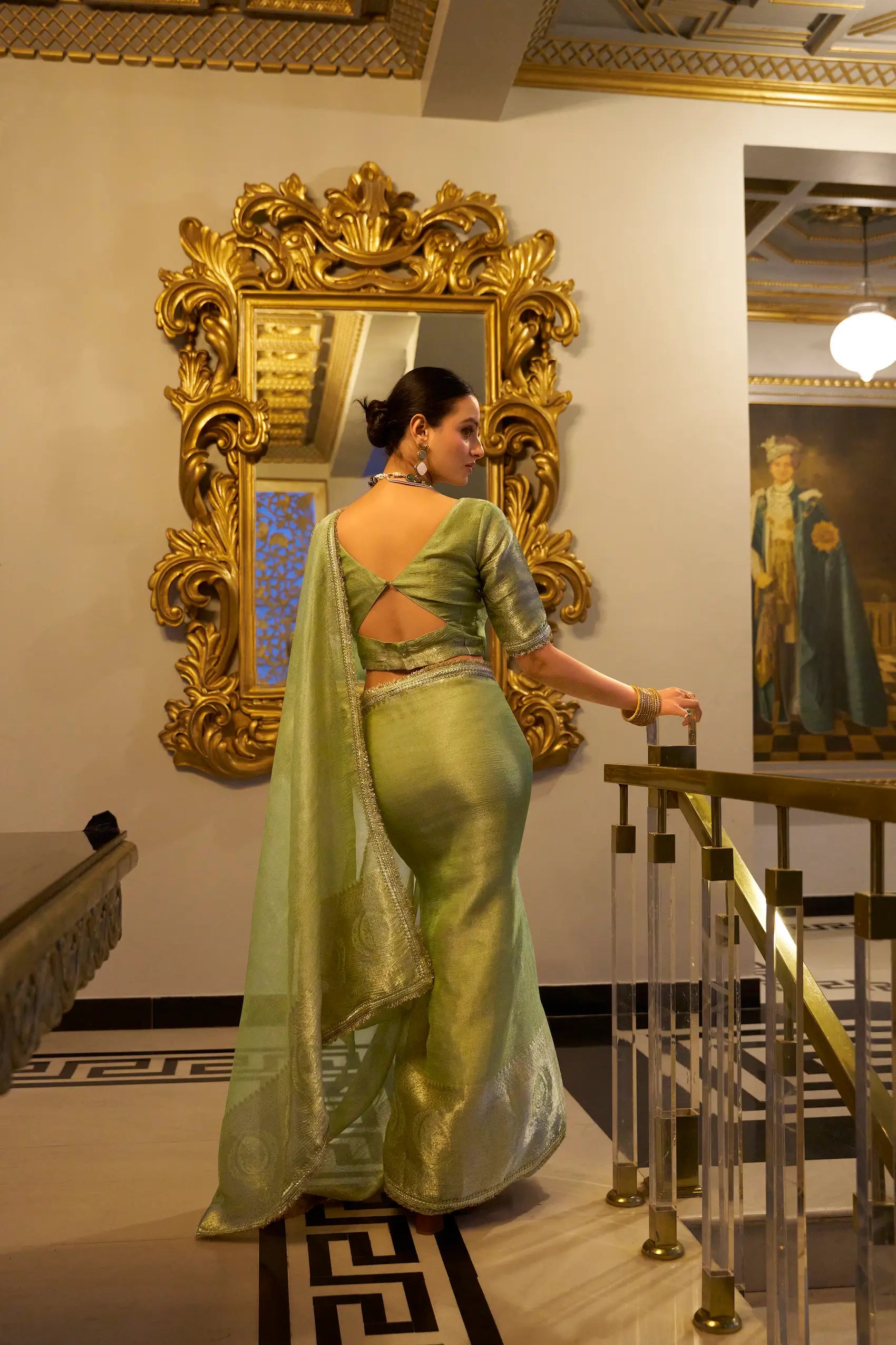Pista Green Shimmer Tissue Saree With Zari Weaving Work & Sequins Lace Border