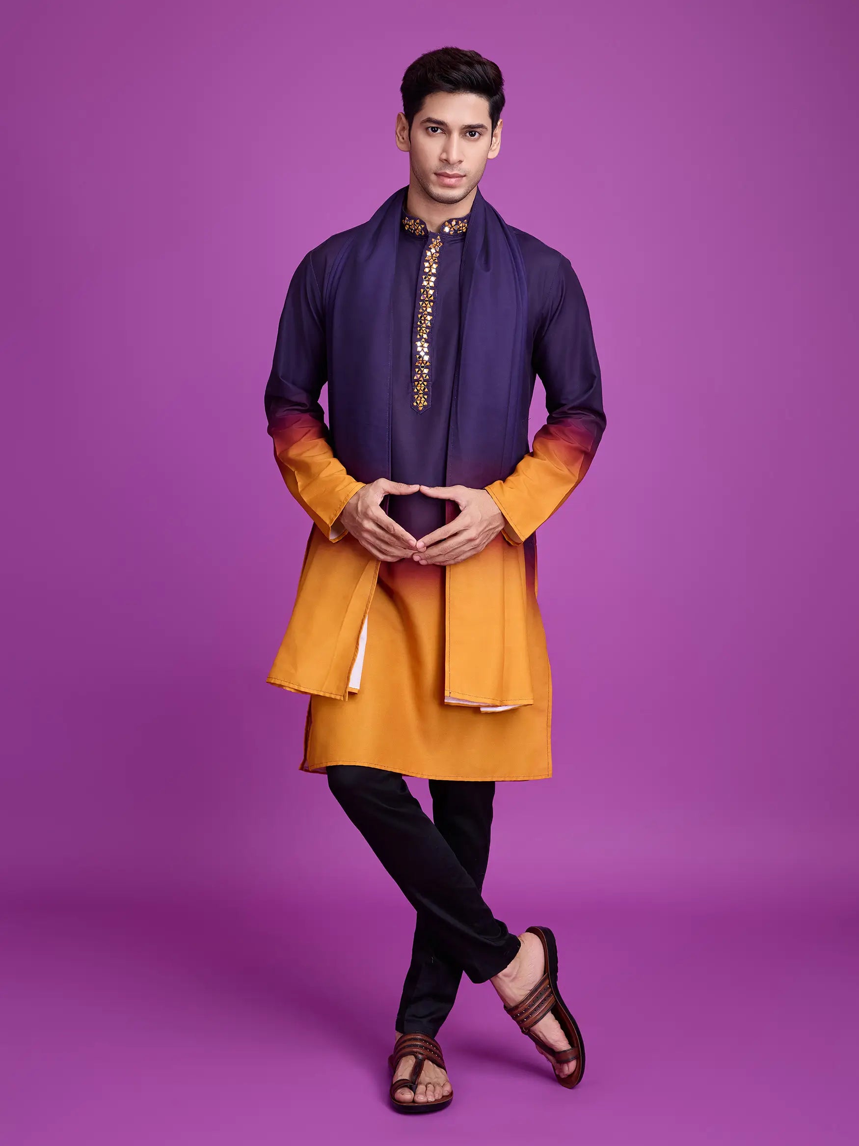 Our Purple & Mustard  Rayon Kurta With Hand Mirror Work Made from premium-quality fabric, it features a relaxed fit that allows ease of movement while maintaining a sharp appearance. The minimalist design is perfect for those who prefer understated elegance. Ideal for festive events, family functions. this kurta pairs beautifully with traditional bottoms or denim. It's a timeless piece you’ll keep reaching for.