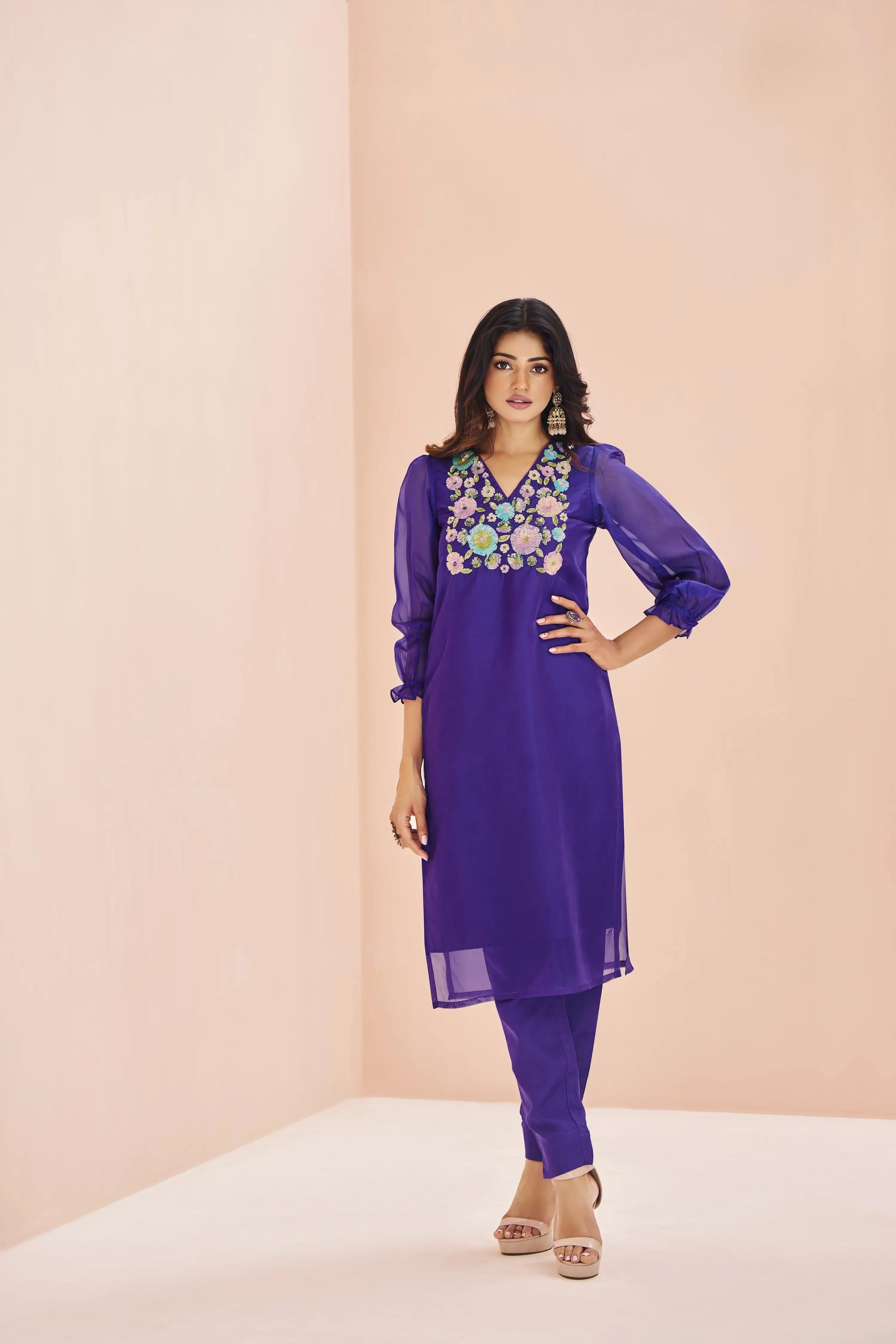 Celebrate the upcoming wedding season with this beautiful Pure Blooming Purple Organza Fabric Straight Fit Kurta Set. The set includes a stylish kurta with matching trouser. Ready to wear, it’s the perfect choice for festive occasions, offering both elegance and comfort.