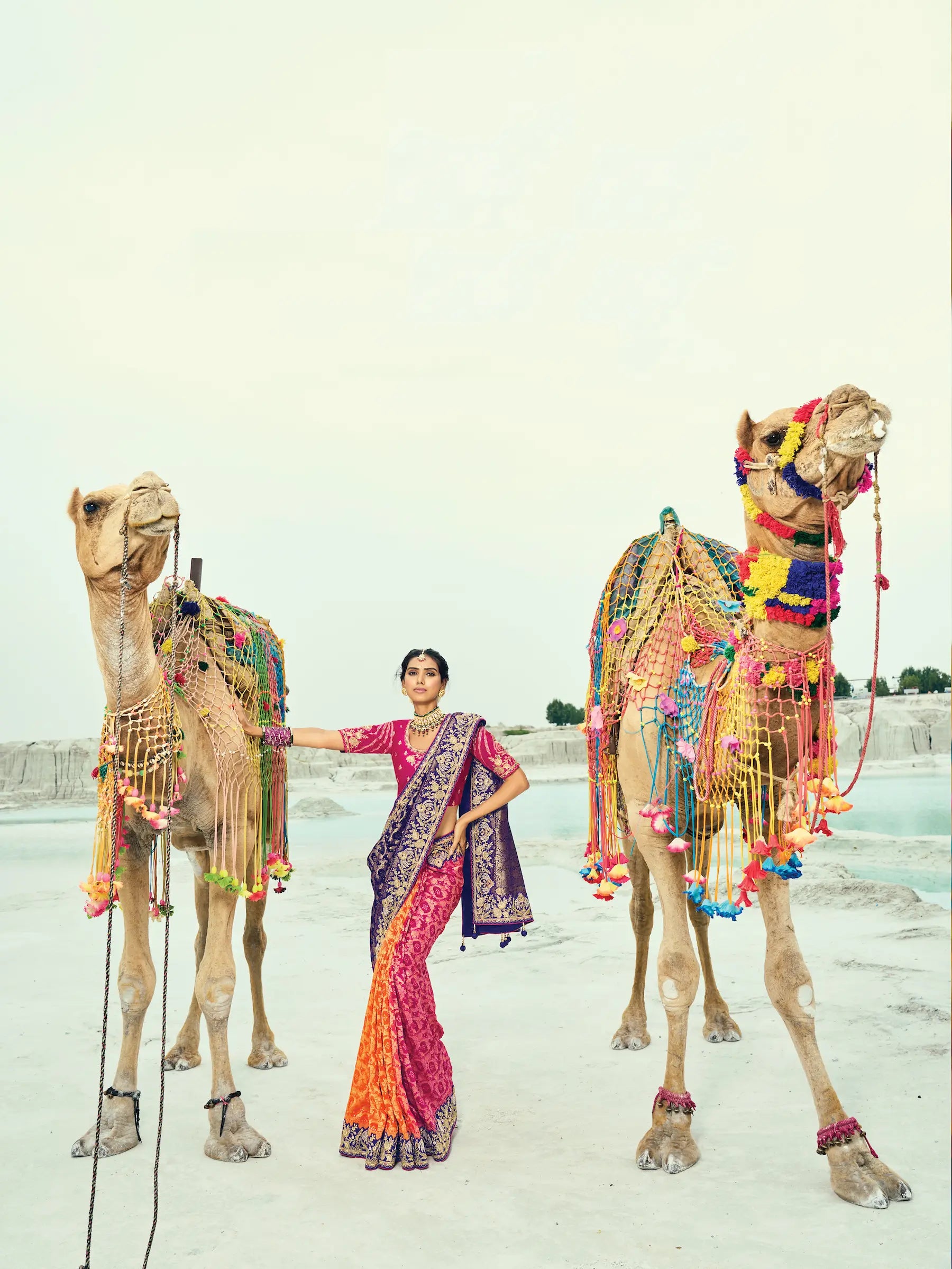 Graceful purple–rani pink-orange georgette bandhej saree with zari weaving, embroidery, moti, cutdana, and handwork, piping border and tassels. Paired with a rani pink silk embroidered blouse, it’s perfect for weddings and festivities.