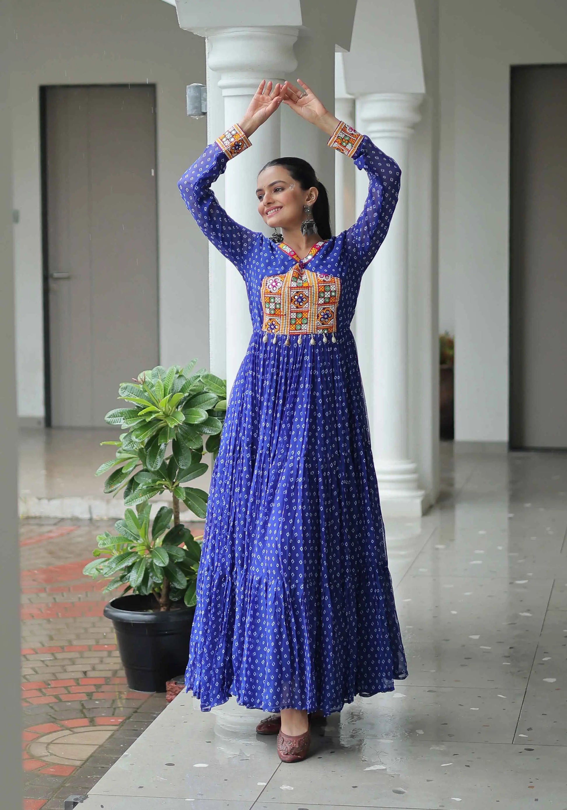 Introducing our new Navratri Collection Gown – crafted in soft, breathable georgette fabric and beautifully adorned with traditional Kutchi work. Designed for comfort and style, it's the perfect choice to twirl through Garba nights and festive celebrations in true ethnic elegance.