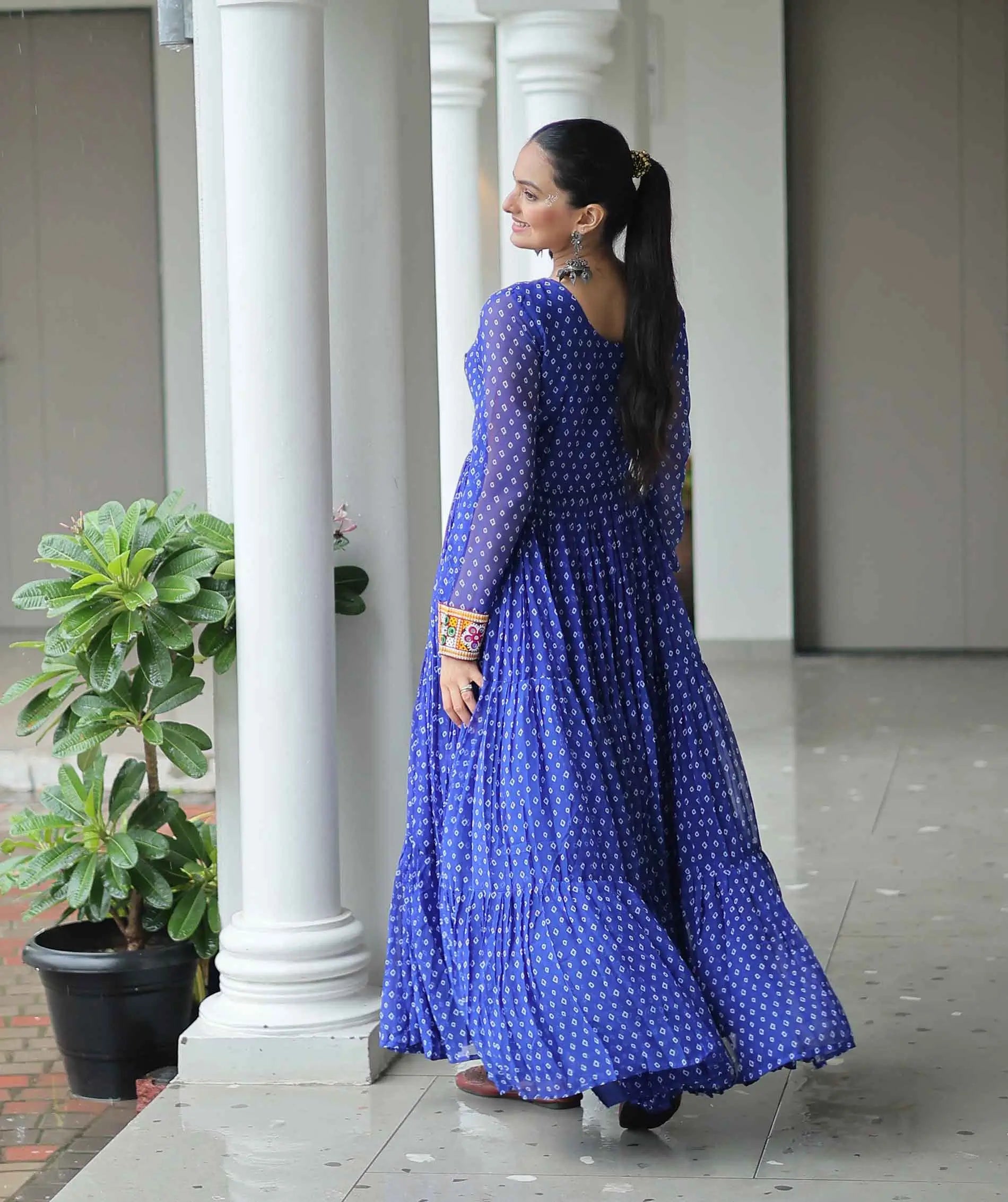 Royal Blue Navratri Gown Bandhani Print With Kutchi Patch Work