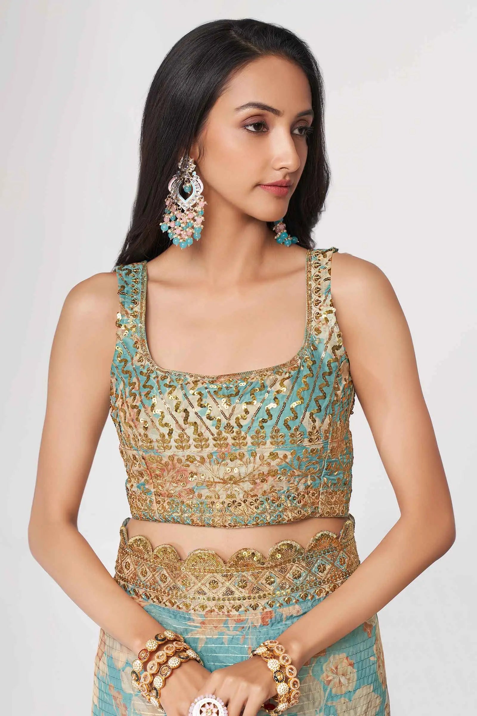 Sky Blue Floral Print Organza Saree With Sequins Work