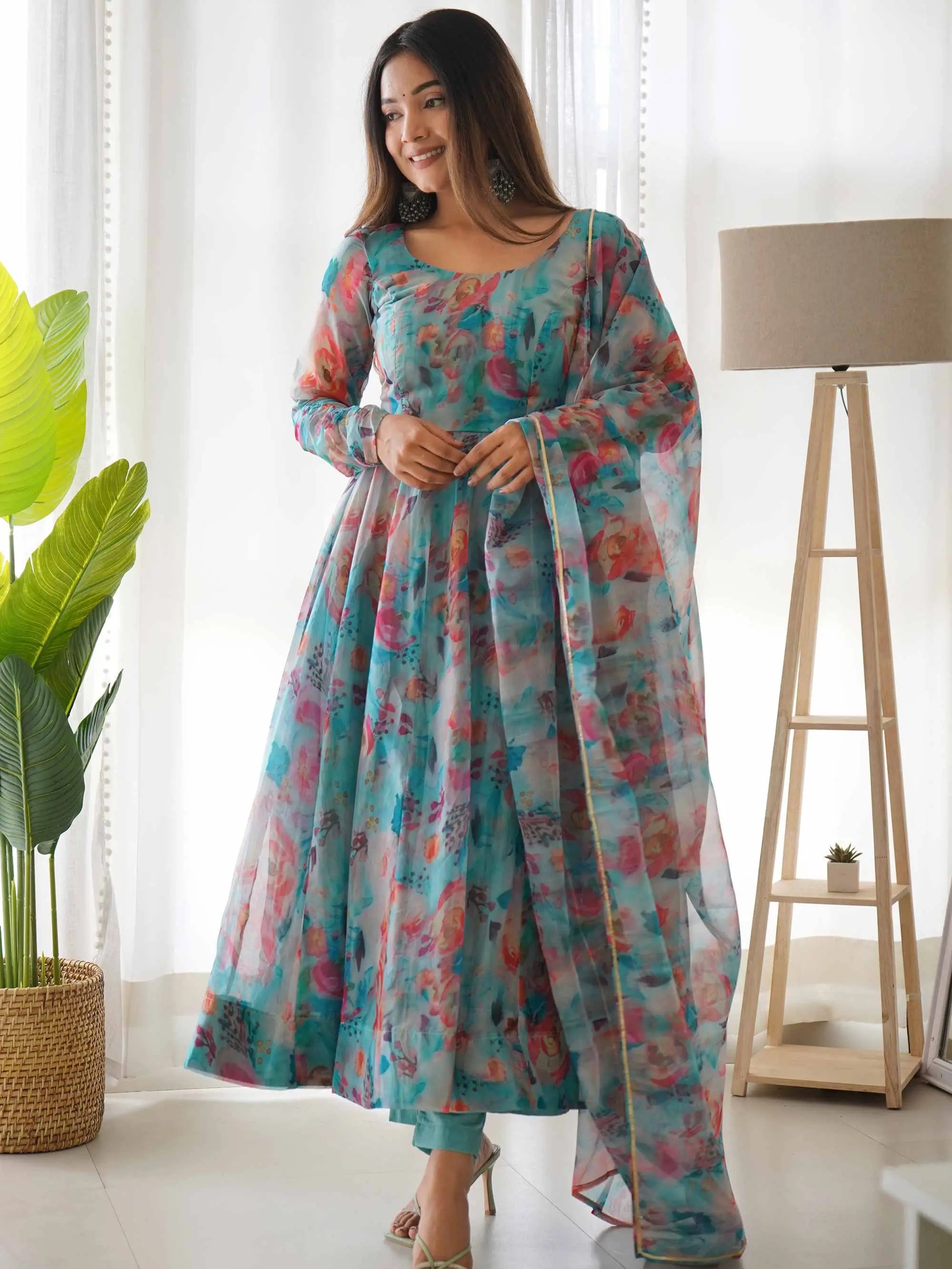 Sky Blue Organza Multi Colored Floral Print Gown With Dupatta
