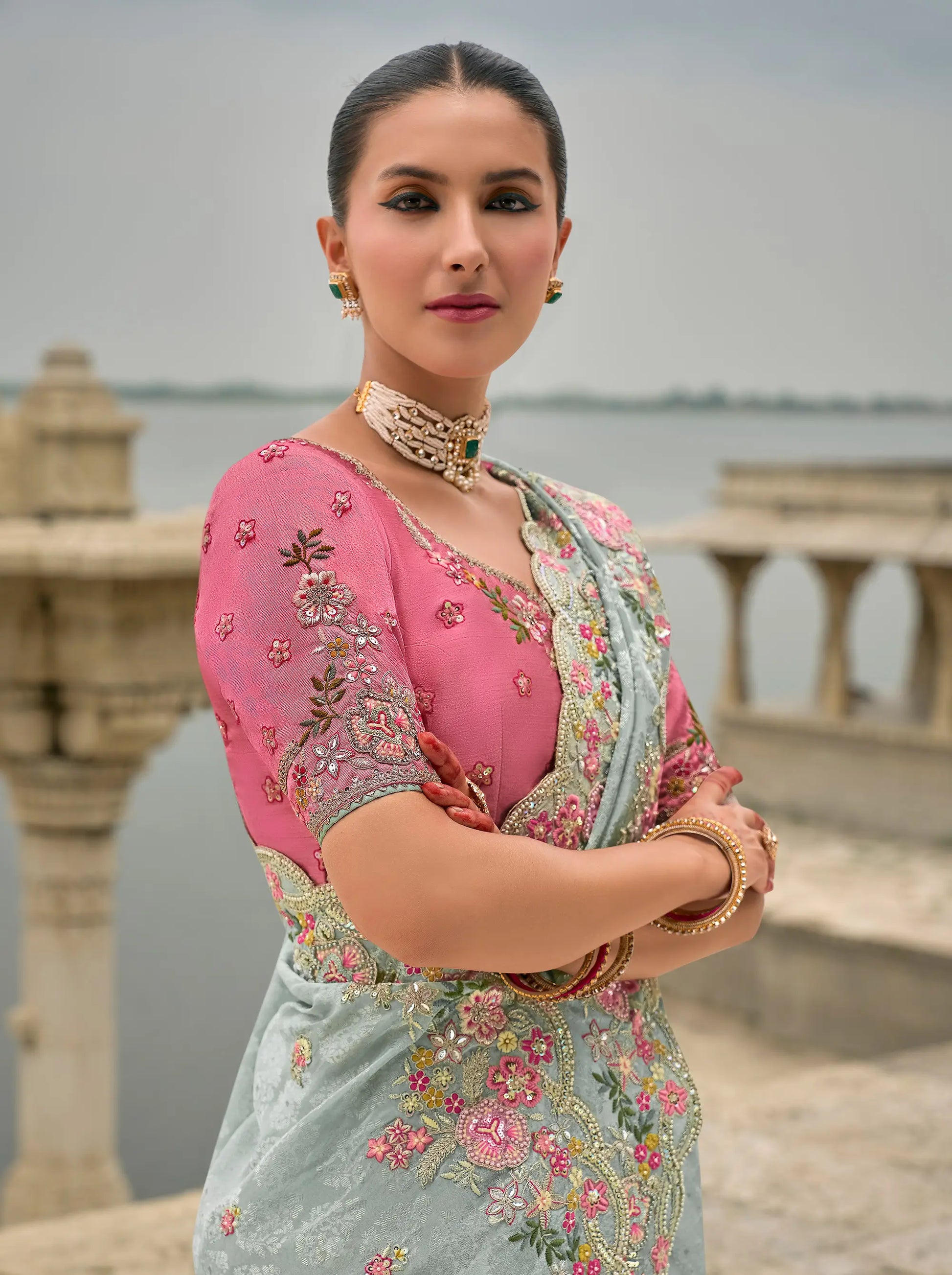 This exquisite ensemble is crafted from pure viscose jacquard fabric, adorned with intricate sequin, stone, embroidery, pearls, khatli, and zari weaving work, complemented by heavy tussles on the pallu. The matching blouse features heavy embellishments in viscose jacquard, making it a perfect choice for weddings and festive occasions.