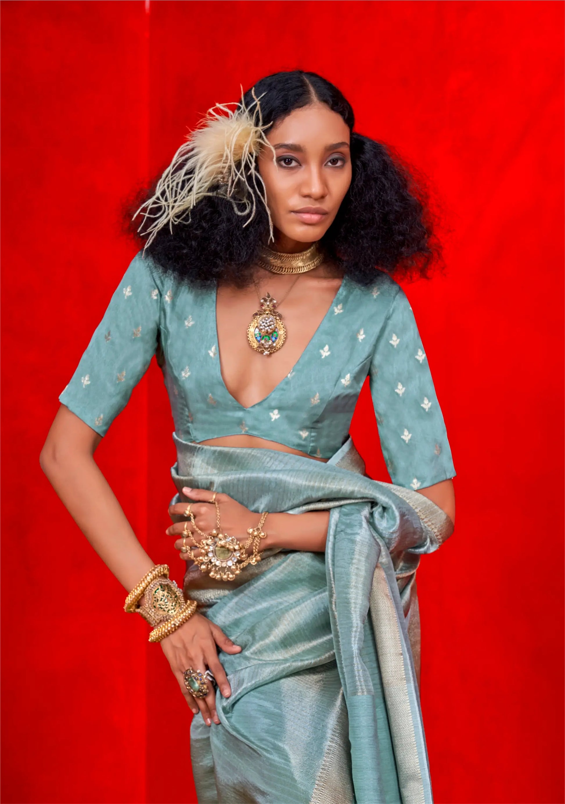 Sky blue viscose zari tissue saree with elegant zari weaving on border and stripes. Comes with a matching viscose jacquard blouse featuring zari weaving work.