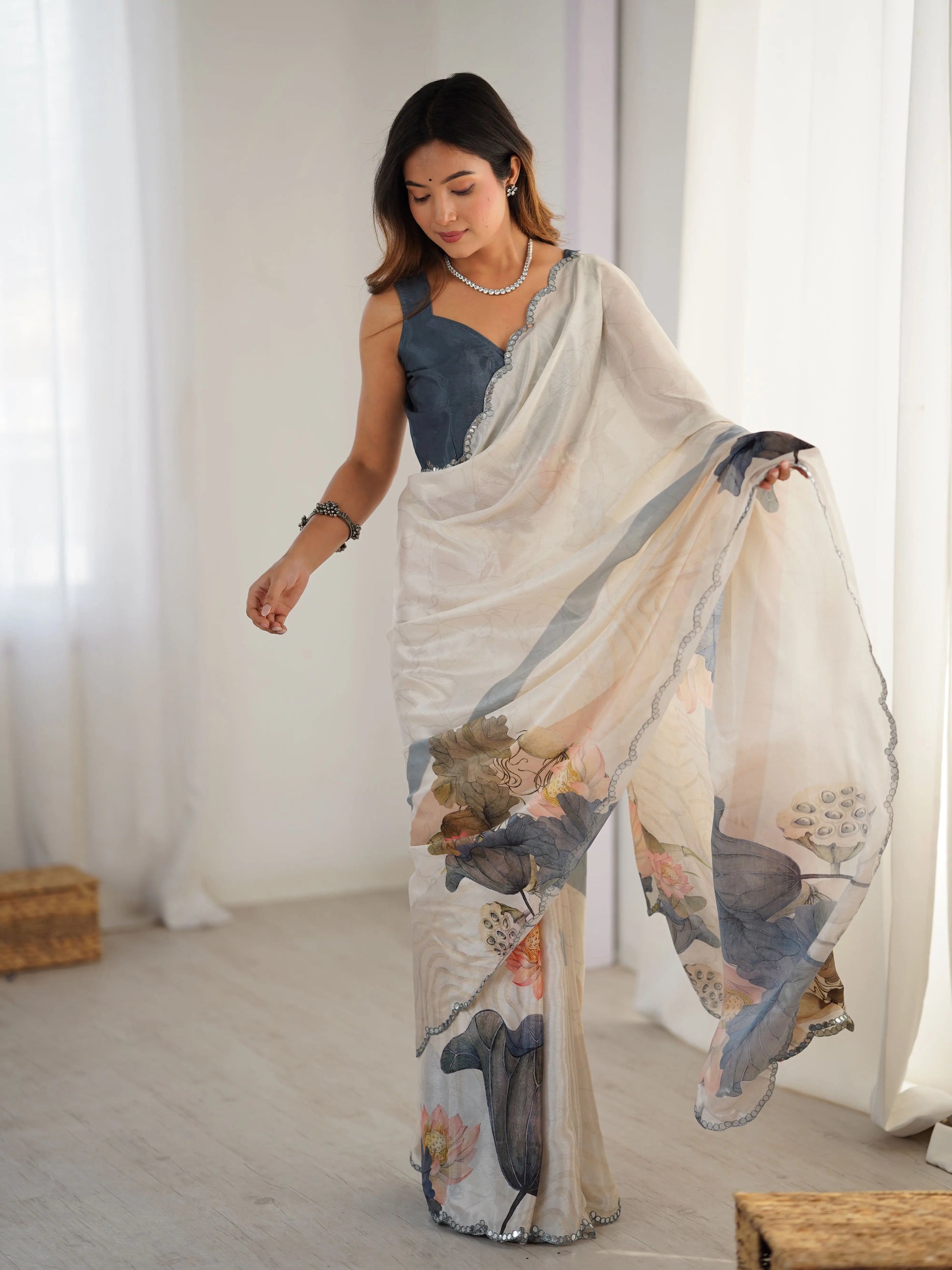 Soft Amber Beige Digital Floral Print With Mirror Cut Work Saree