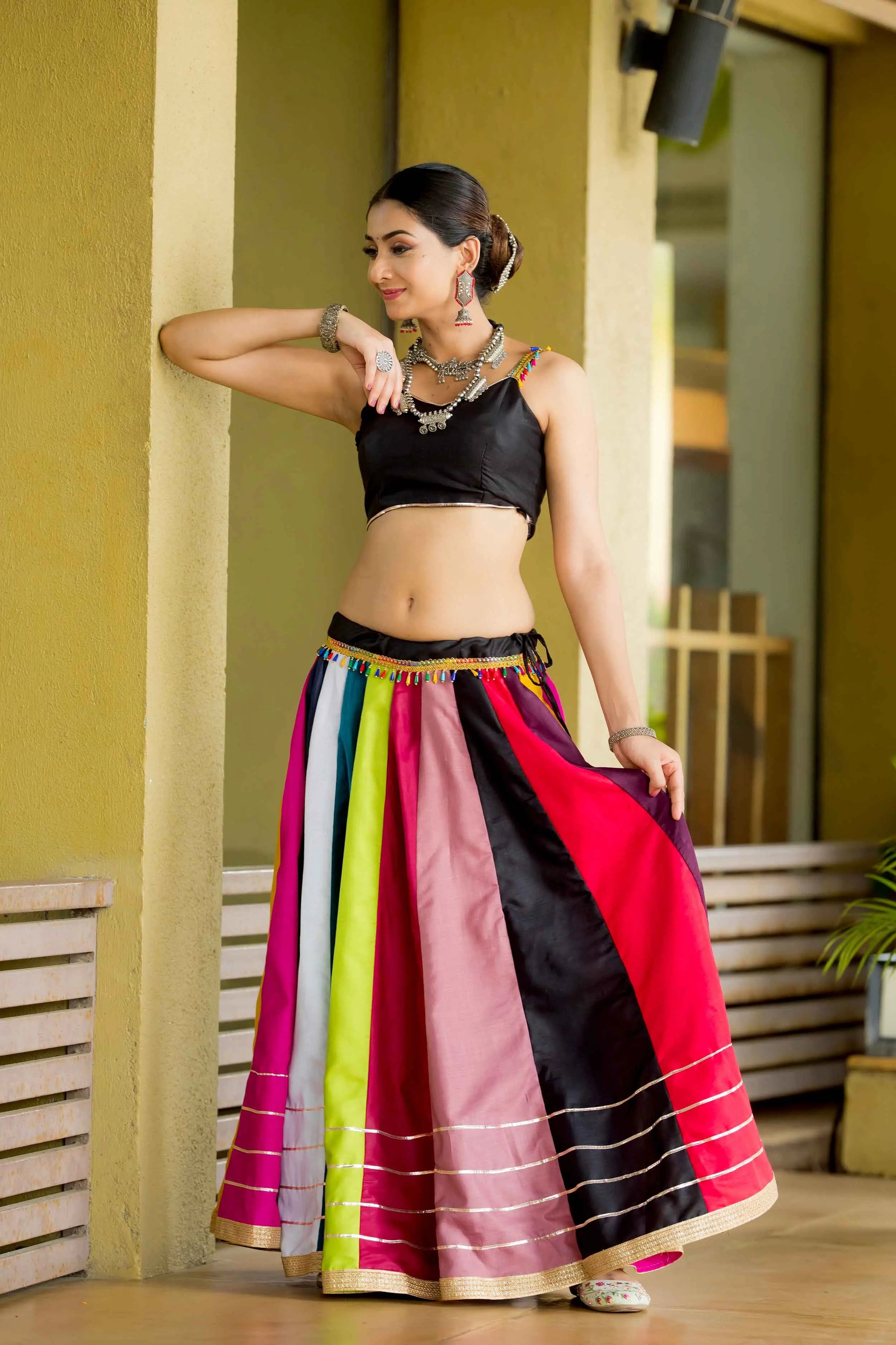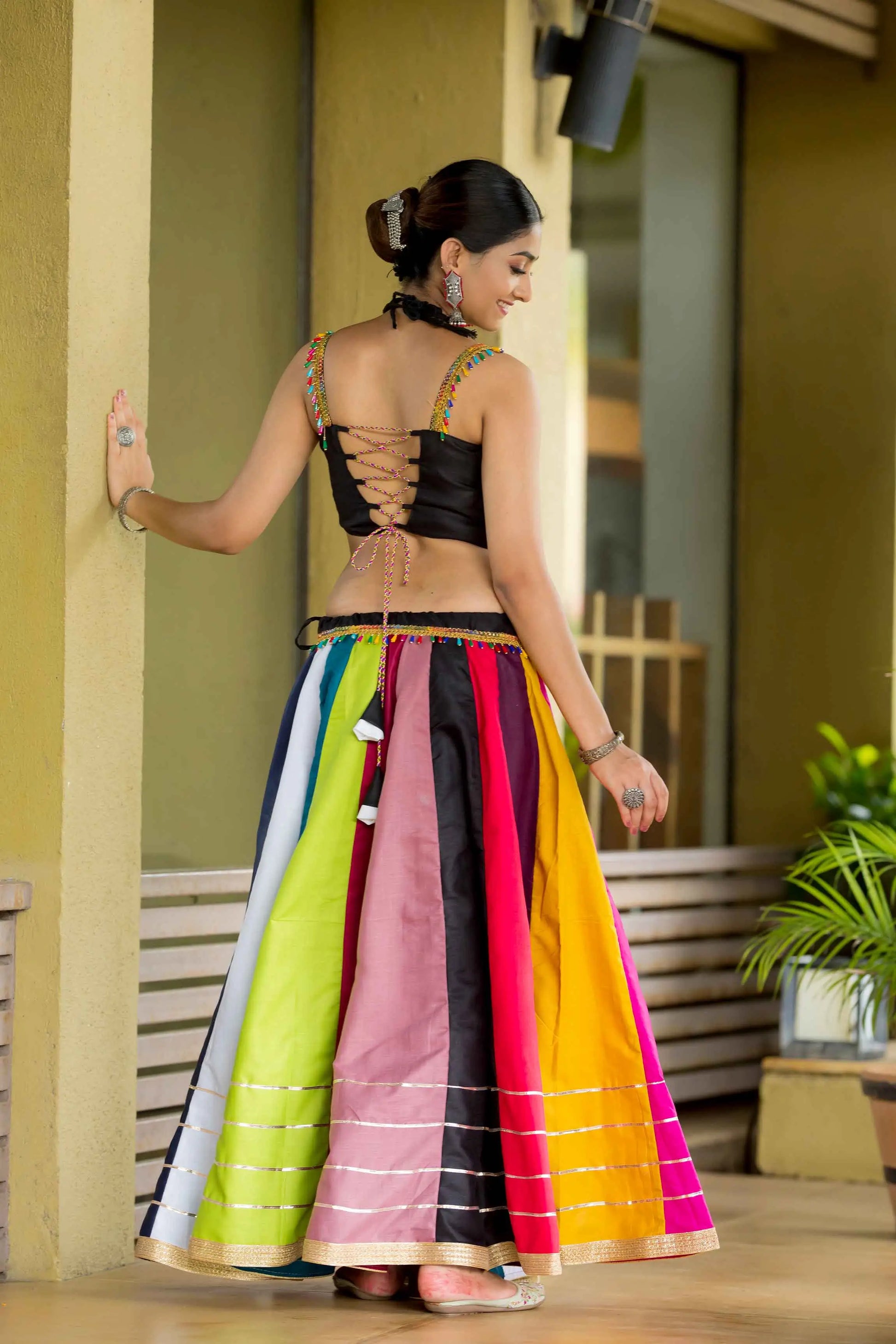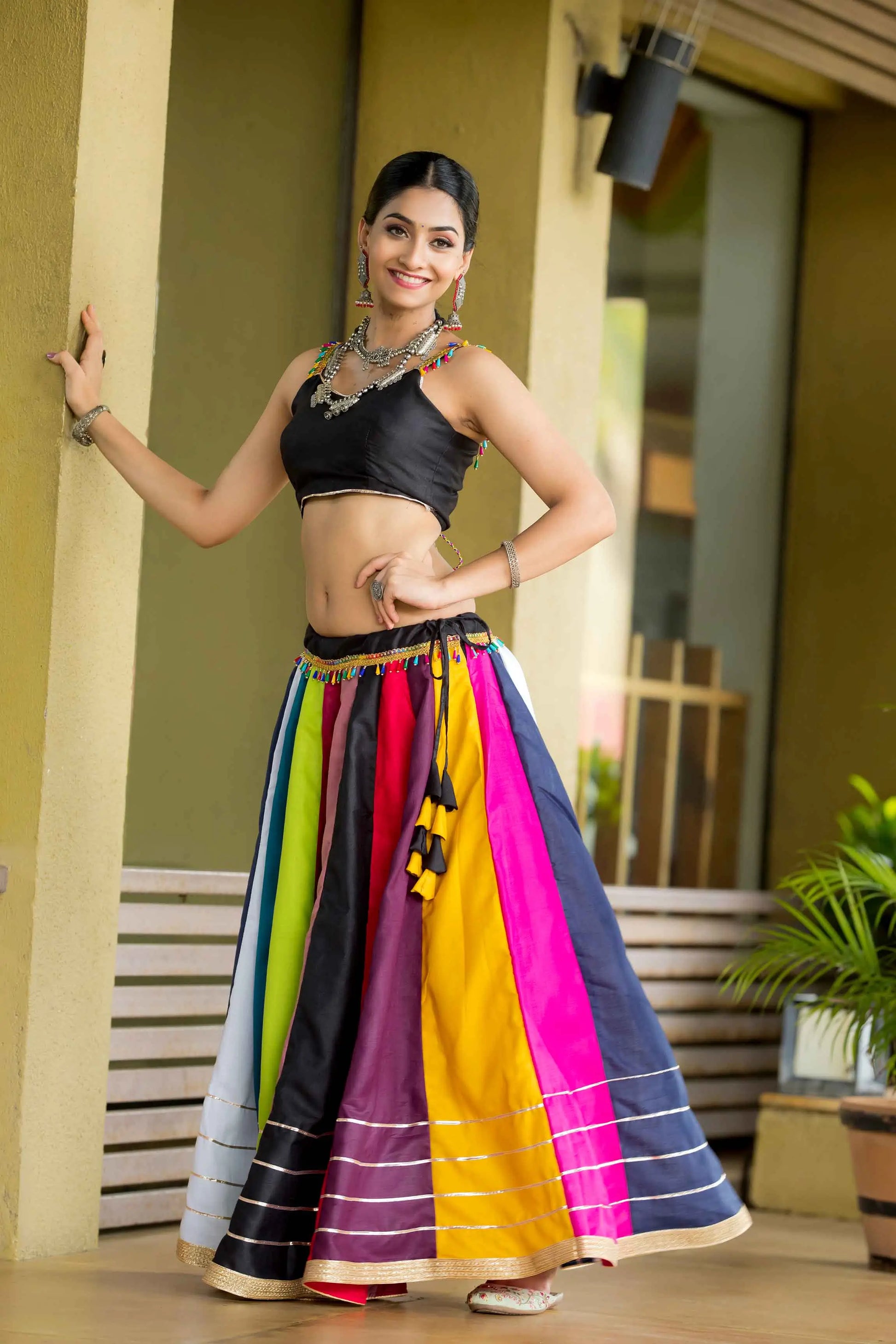 Step into the festive season with a multi-colored cotton chaniya choli, plain kali with gota- lace and beautiful cowrie (kodi) work – embrace the joy and elegance of navratri!, this ensemble is perfect for festive garba nights. Dance in comfort and style!