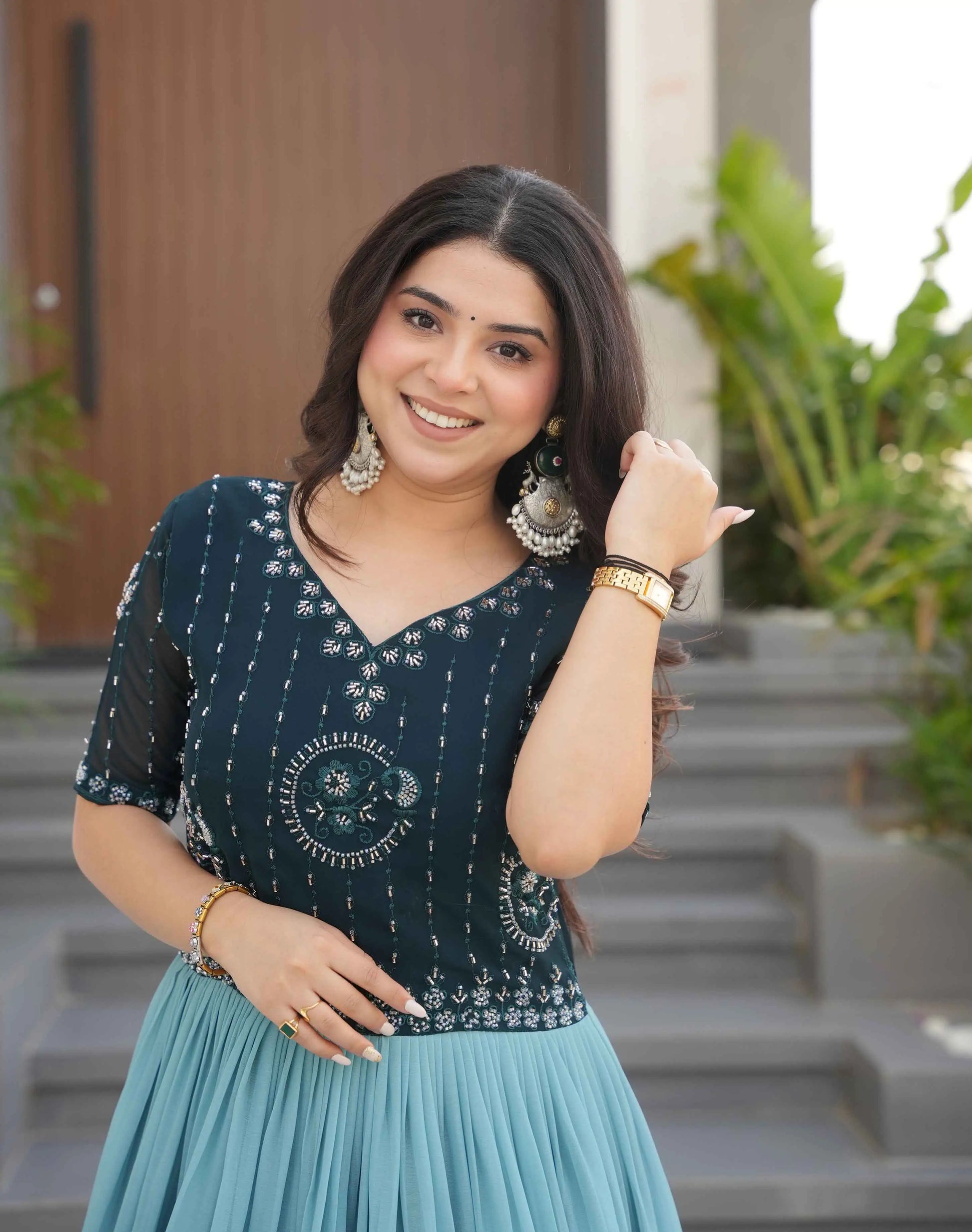 Teal Blue Floral Padding Digital Print Gown With Beads Embroidery Work
