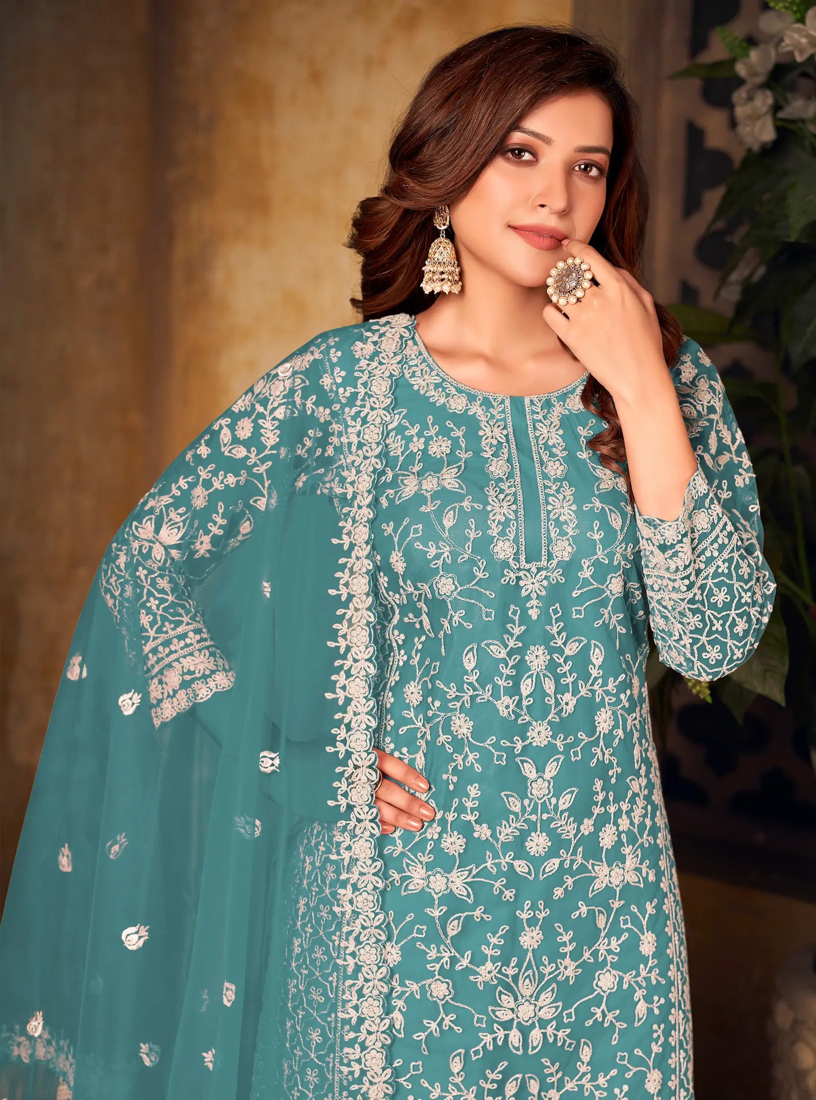 Teal Blue Net Thread & Sequence Embroidery Work Salwar Suit