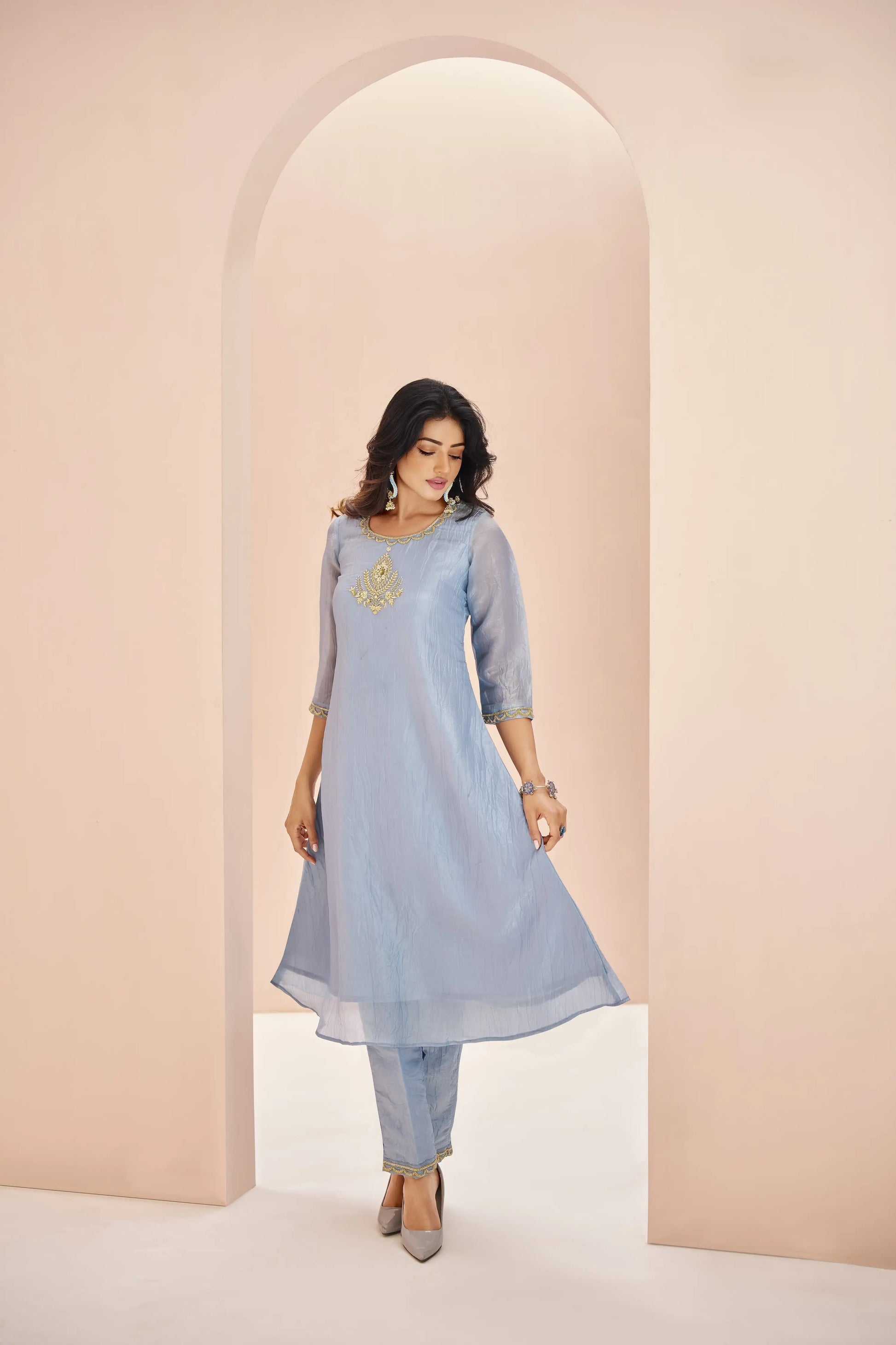 Celebrate the upcoming wedding season with this beautiful Pure Blooming Teal Blue Organza Fabric Straight Fit Kurta Set. The set includes a stylish kurta with matching trouser. Ready to wear, it’s the perfect choice for festive occasions, offering both elegance and comfort.