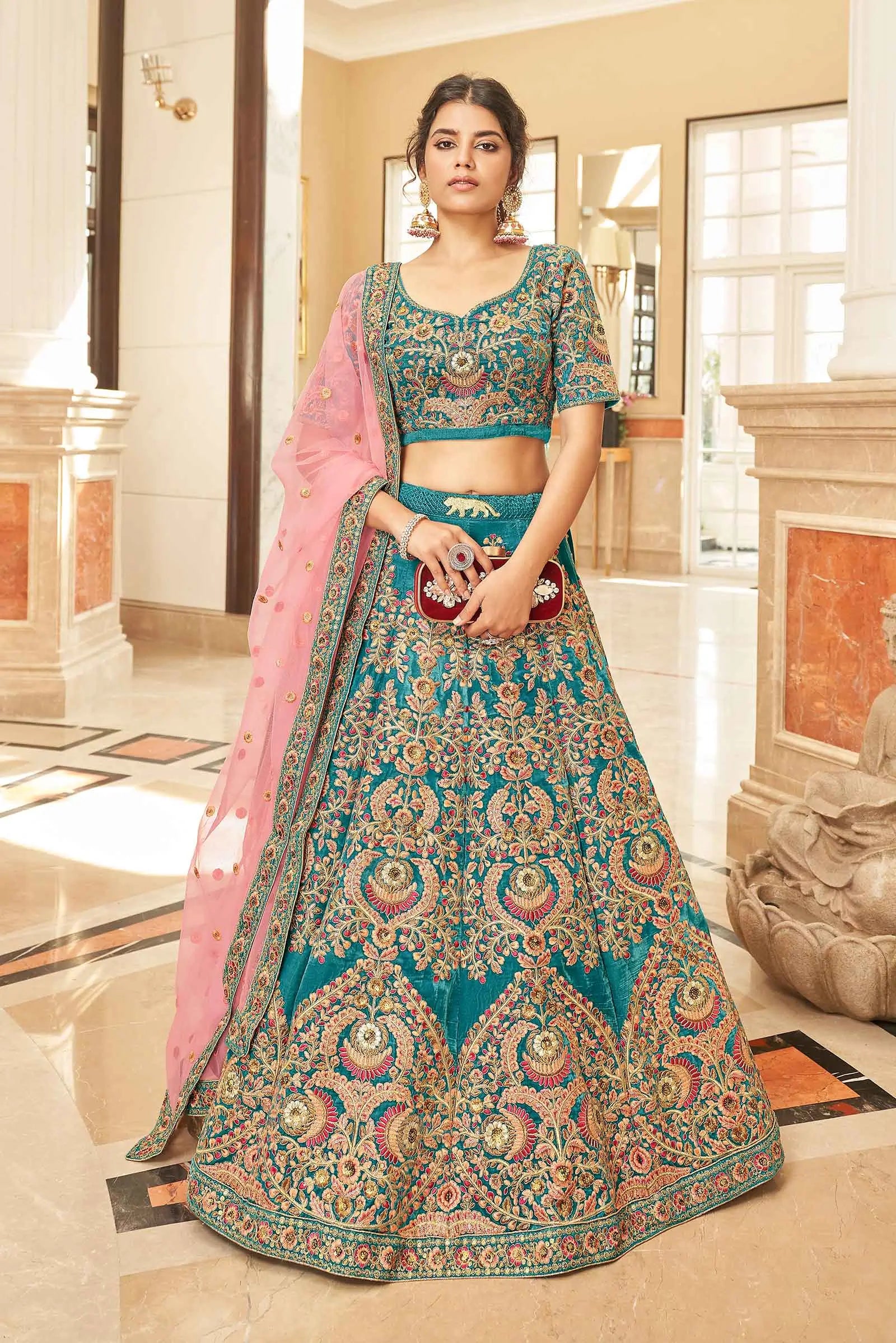 Teal Blue Velvet Lehenga Choli With Thread, Dori, Zari And Sequins Embroidered Work