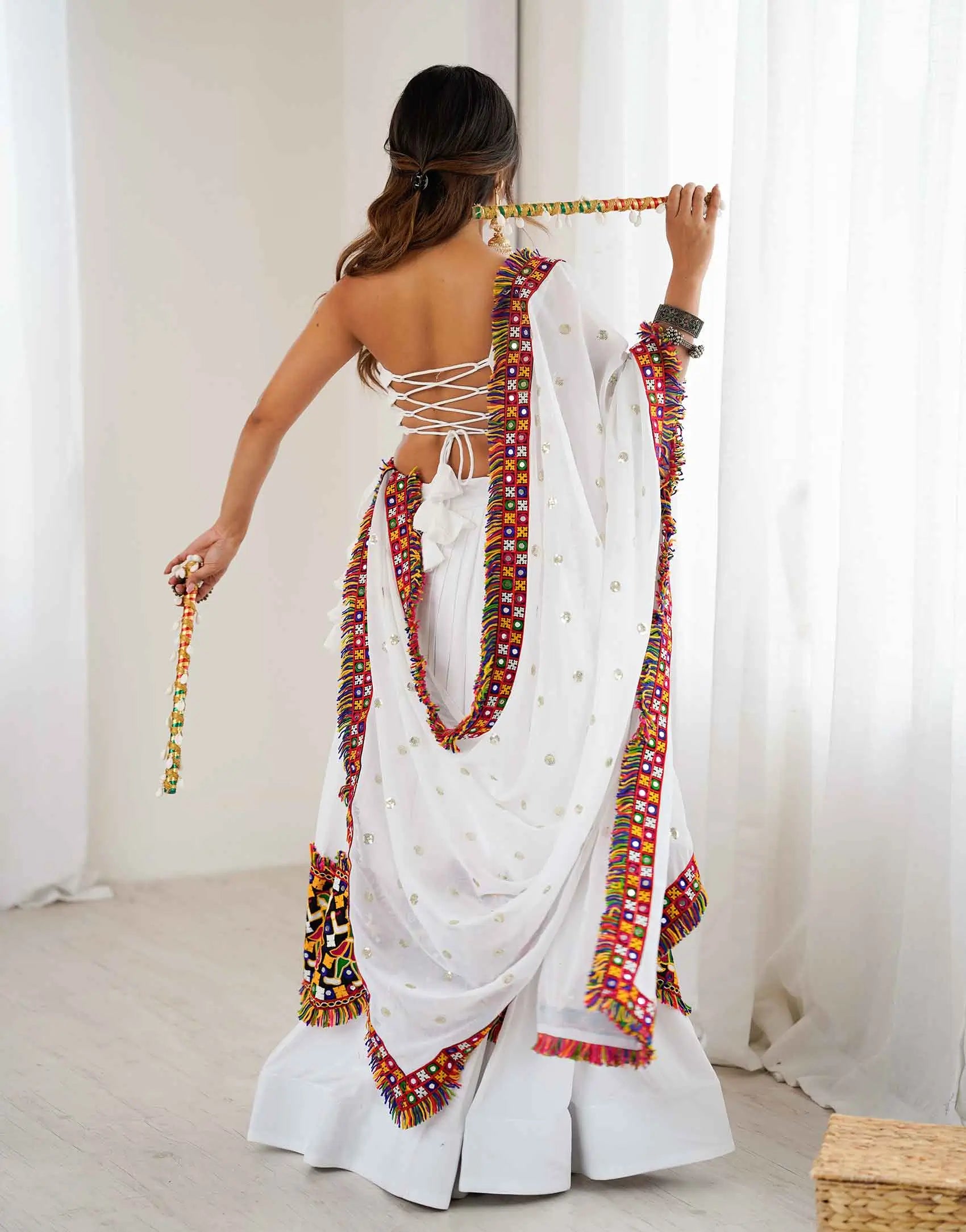 White Multi Thread Gamthi Patch Work Rayon Navratri Lehenga Choli