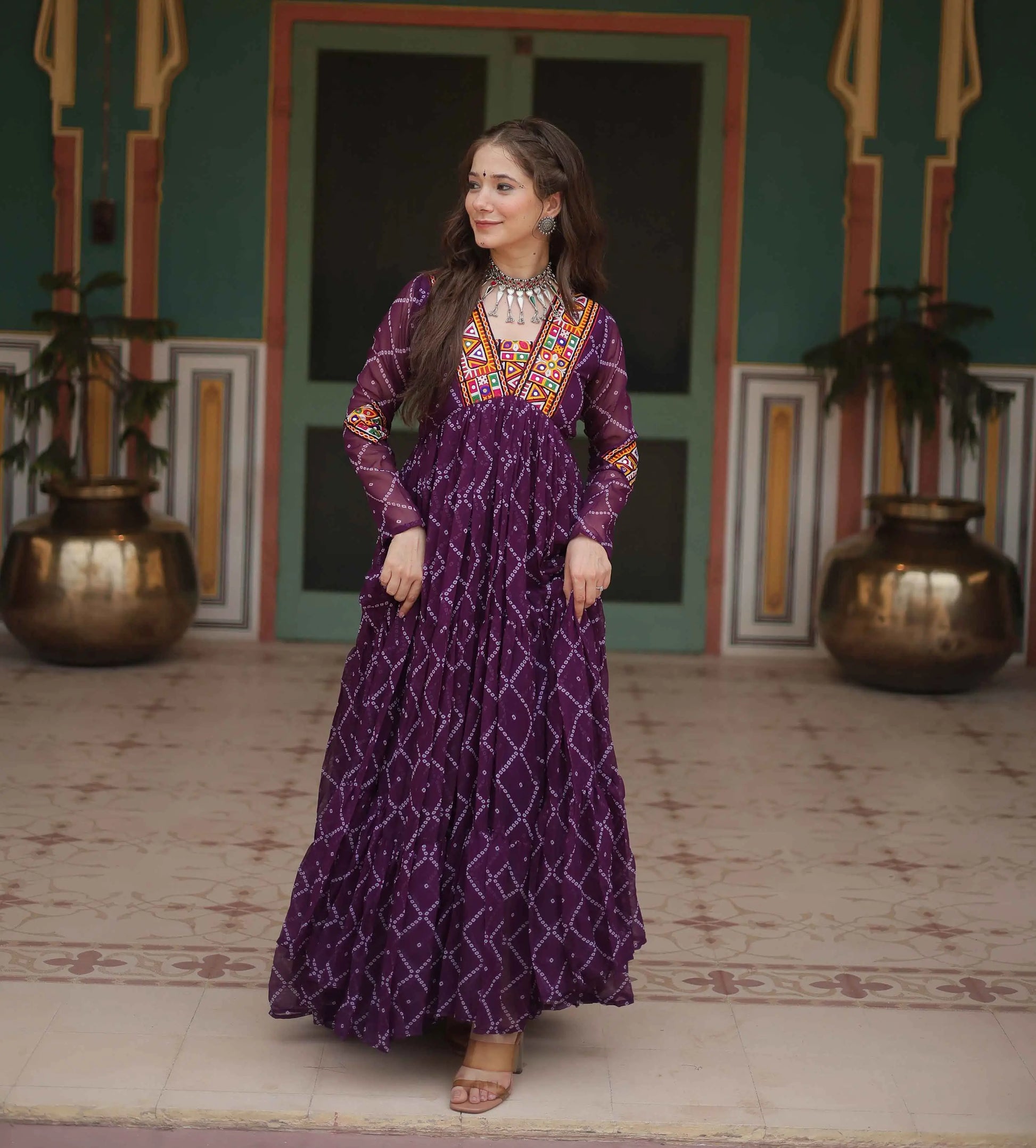 Wine Bandhani Print With Kutchi Patch Work Navratri Gown