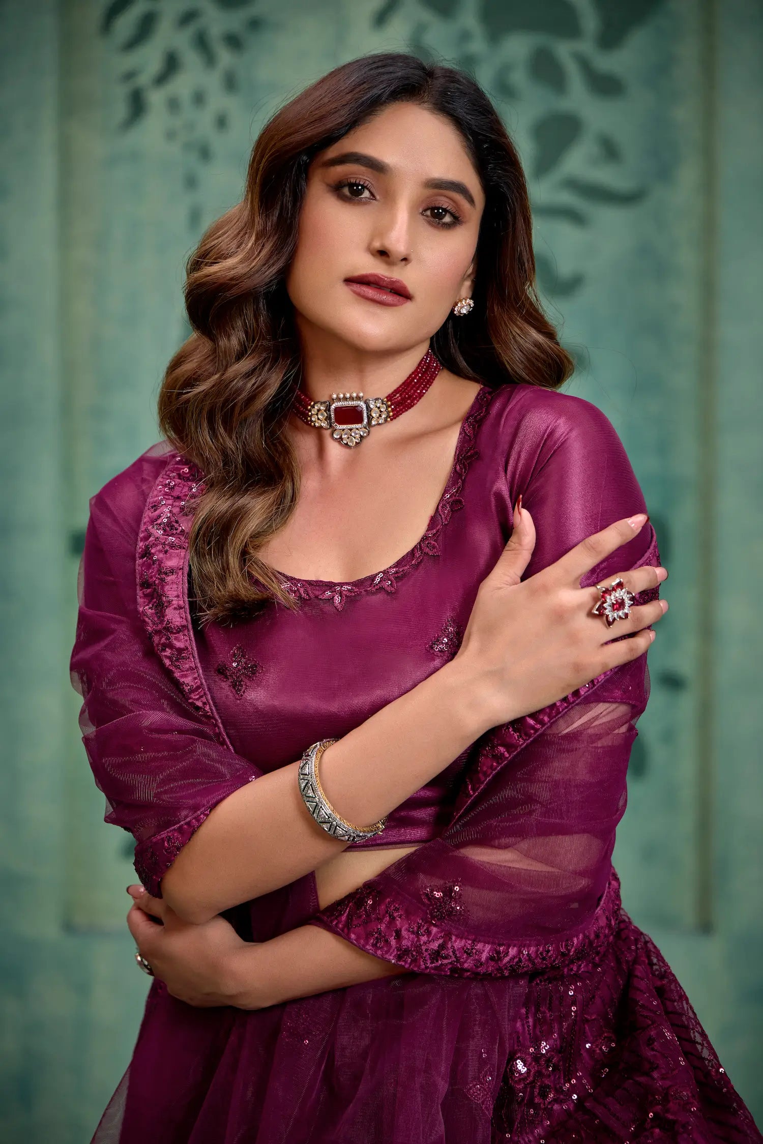 Wine Net Lehenga Choli With Thread & Sequence Embroidery Work