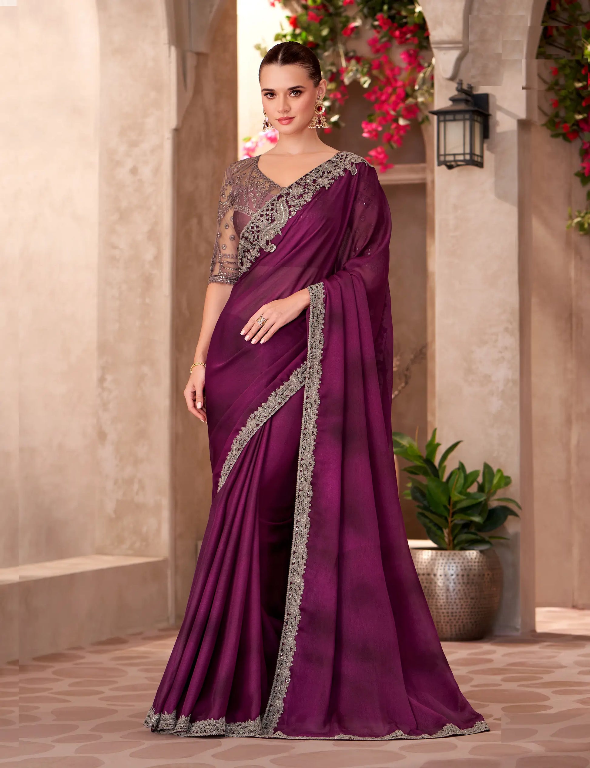 Wine Shaded Satin Chiffon Embroidery Work Saree