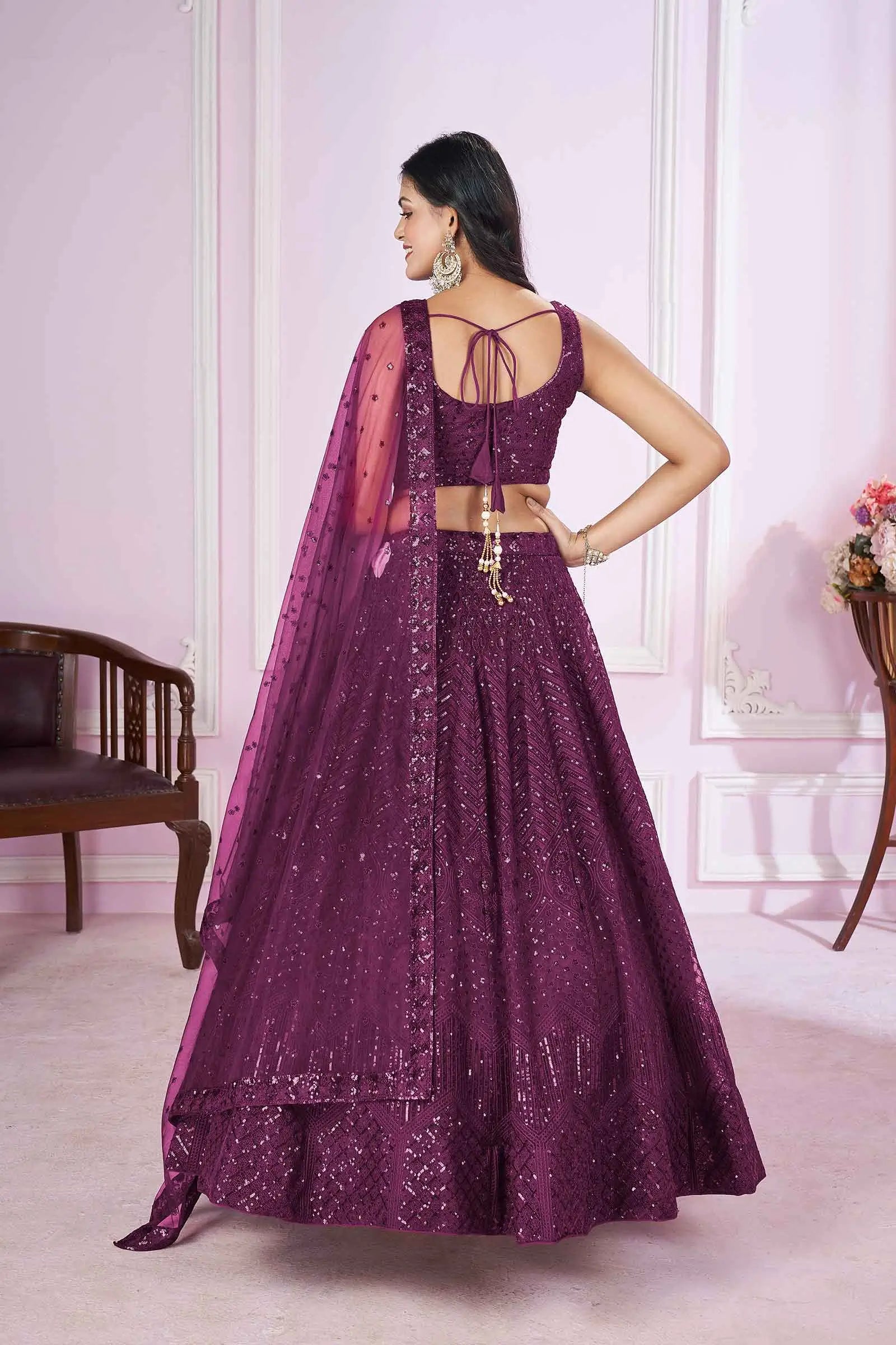Wine Soft Net Lehenga With Sequins And Thread Embroidered Work