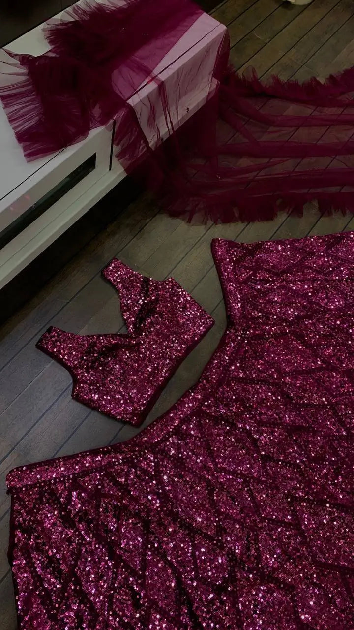 Wine Velvet Thread & Sequence Embroidery Work With Ruffle Border Lehenga Choli