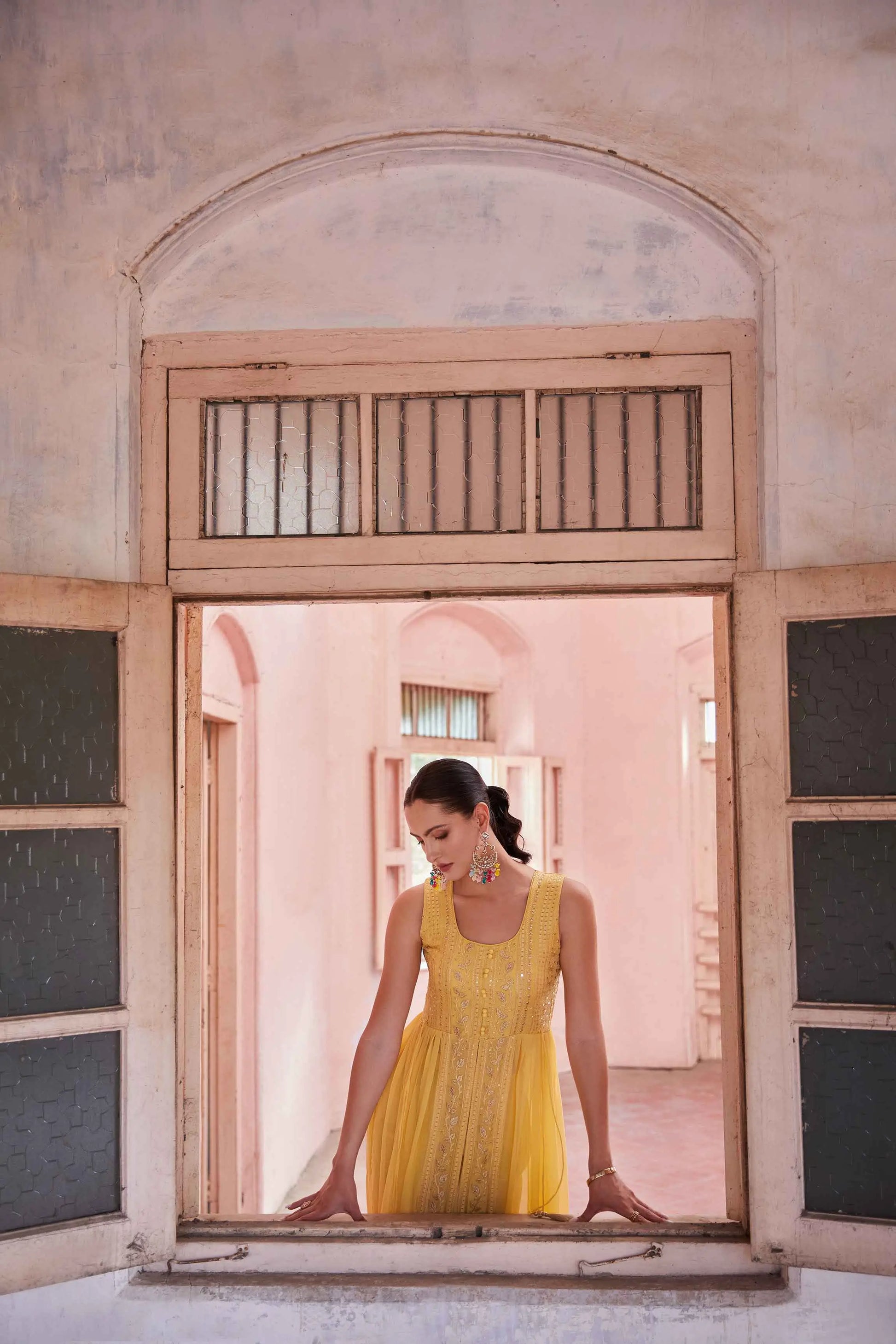 Upgrade your everyday look with our Yellow Indo-Western Gown, crafted to blend effortless elegance with lasting comfort. Made from lightweight georgette fabric, it features a sleek silhouette that flatters every figure. Perfect for parties, evening outings, or stylish night events.